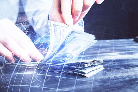 Multi exposure of financial graph drawing hologram and USA dollars bills and man hands. Analysis concept.