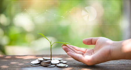 Investor hand with coin and plant growing putting coins to stacking for money saving profit and business investment growth concept.