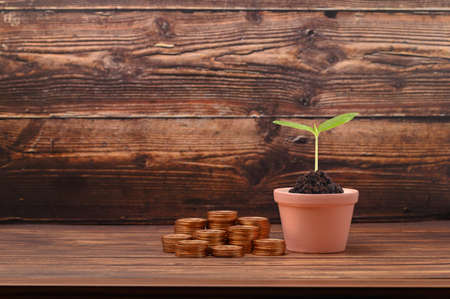 Coins with growing plant on wooden table. Money savings concept
