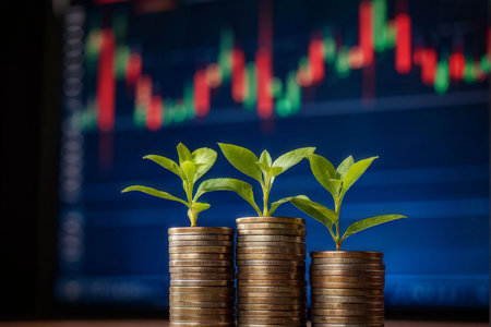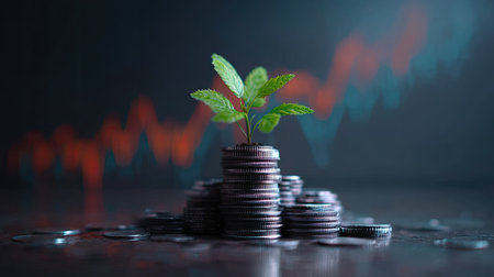 A vibrant green plant emerges from stacked coins on a reflective surface, symbolizing financial growth and investment alongside a dynamic financial graph background.
