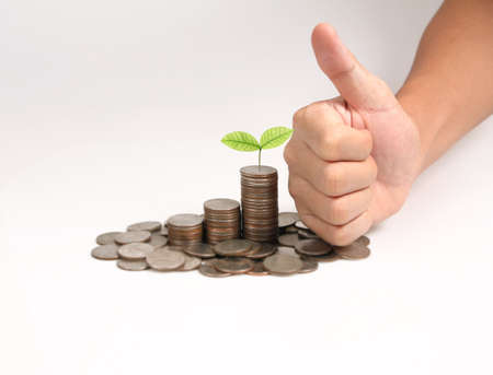 hand holding money putting on coins stack with plant growth