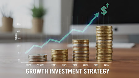 A close-up image presents coin stacks arranged to suggest financial growth. A rising line graph overlays the coins, culminating in a dollar sign. The composition features a wooden surface and soft lighting, suggesting a professional setting. Ideal for illustrating concepts related to finance, investment strategies, and economic progress, it can be used in various commercial applications.