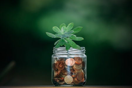 A glass jar filled with coins showcases a growing plant. The image highlights the contrast between the currency and the natural element. The composition is simple, featuring a wooden surface as the backdrop. The visual is suitable for depicting concepts related to savings and investments. It can be used for financial and business-related visuals.