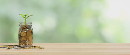 3D rendering, investment and saving money concept, coins in glass jar with growing plant on wooden table with copy space in blurred background, 3D illustration
