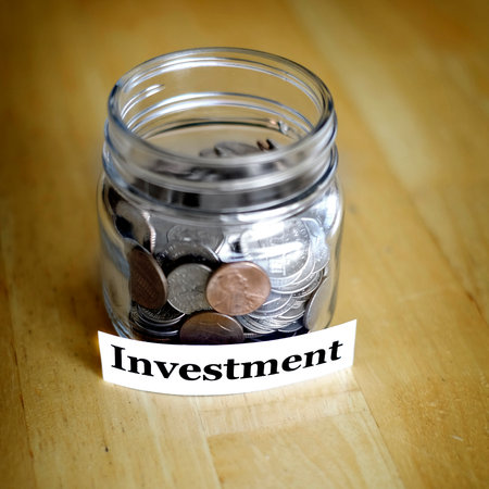 Coins accumulating in a labeled glass jar represent building wealth through successful investments and long term financial planning