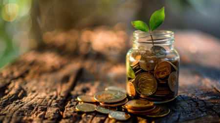 A small plant sprouts from coins inside a glass jar, set on a weathered wooden surface. The image features a shallow depth of field, with soft sunlight illuminating the scene. The composition highlights the contrast between the green plant and the metallic coins. This image could be used for financial or ecological concepts.