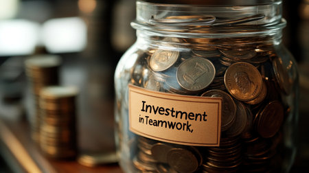 Investment in teamwork is symbolized by glass jar filled with coins, representing savings and collaboration..