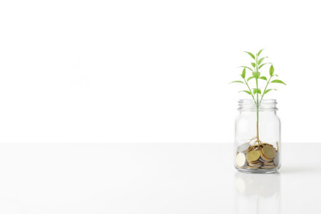 A plant sprout growing from a jar of coins. Space for text