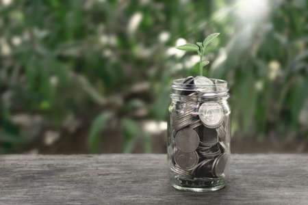 oins inside a glass jar with a small green plant sprouting to represent investment or wealth.The concept of saving and increasing cash savings. exchange rate and investment growth concept.