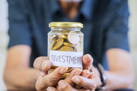 Senior man hand showing a jar full of golden coins with investment text. Finance and Investment concept