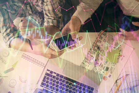 Double exposure of forex graph drawing and man and woman working together holding and using a mobile device. Trade concept.