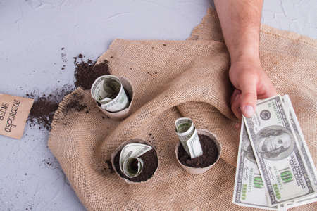 Capital and wealth growing concept. Dollar banknotes grow from fibre pots.