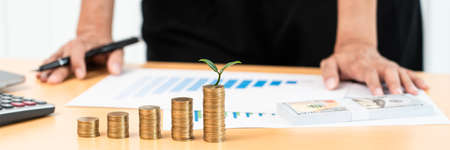 Saving money and investment concept, Business accountant woman stacking coins into increasing columns stack for budget behind desk with charts graph focus on money
