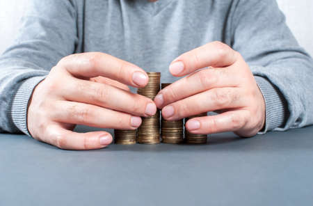 A man puts a coin into a pile. The concept of accumulating or saving money. Close-up