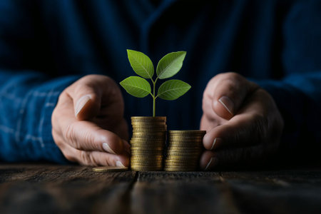 Hand protecting small plant growing from stack of coins, symbolizing financial growth and sustainability. image conveys sense of nurturing and investment in future