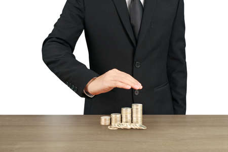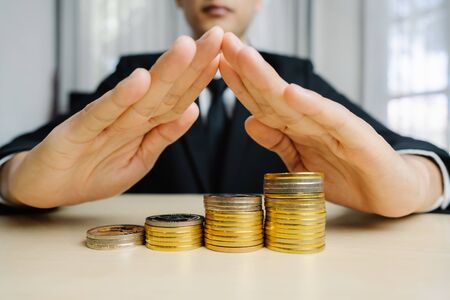 Businesman protect staced of money coins on wood table with blackbackground