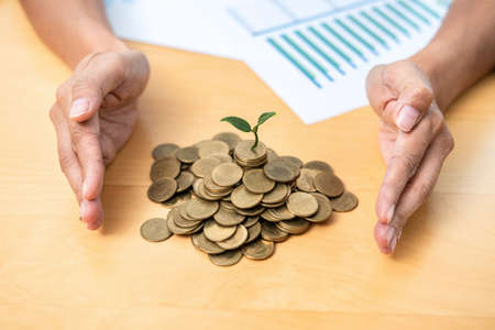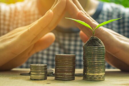 Hand protecting coins stacking with plant growth on the table. Money saving dividend yield and return profit investment concept.
