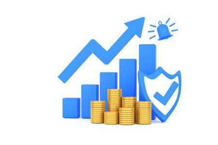 3D. Blue rising arrow, profit bar graph and shield with multiple arrangements of coins.