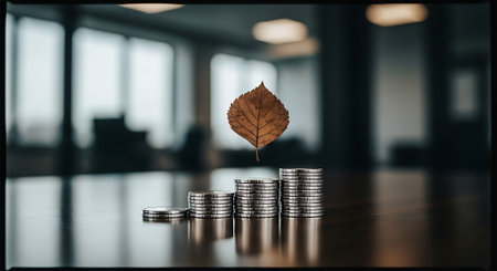 A single autumn leaf delicately balanced on stacks of coins in a modern office setting with blurred background.