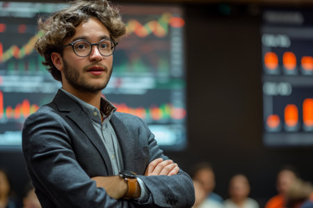 Young entrepreneur explaining concepts against a backdrop of glowing stock market screens