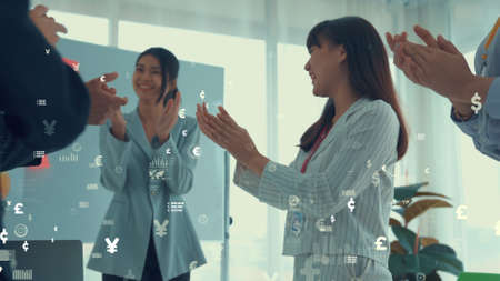 Business people in corporate staff meeting with envisional graphic . Concept of digital technology for marketing data analysis and investment decision making .