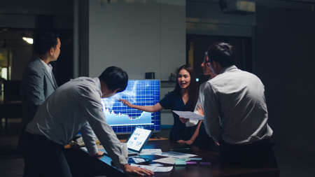 Asia businessmen and businesswomen meeting brainstorming ideas conducting business presentation project colleagues working together plan success strategy enjoy teamwork in small modern night office.