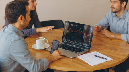 Business team on meeting to planning investment trading project and strategy of deal on a stock exchange with partner, financial and accounting concept, collaborative teamwork analyze data.