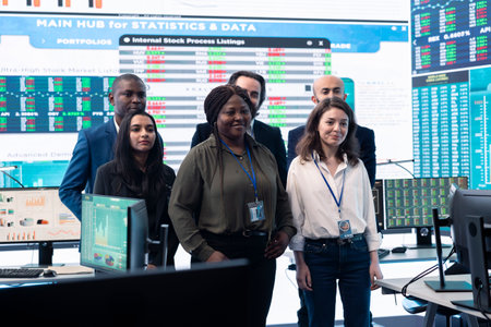 Confident smiling enterprise team uniting their forces to improve workflow and efficiency, achieve organizational goals. Diverse group of analysts work in telecommunications control room.