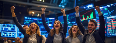 Celebrating successful trades, professionals cheer in a bustling trading room filled with financial displays and data at an investment firm