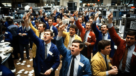 Intense stock exchange action broker commands amidst trading chaos data and trader filled environment
