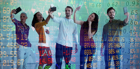 Business people taking selfie through mobile phone against white background against stocks and shares
