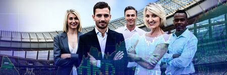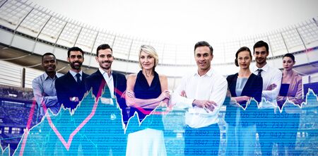 Confident business people with arms crossed standing over white background against stocks and shares