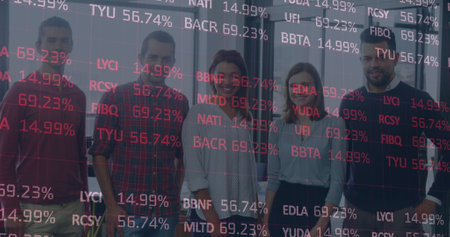 Image of financial data processing over business people. global business, connections and data processing concept digitally generated image.