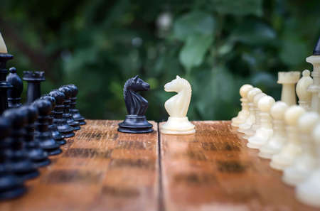 camping in a game of chess. 2 chess knight is standing on a Board on a background of trees