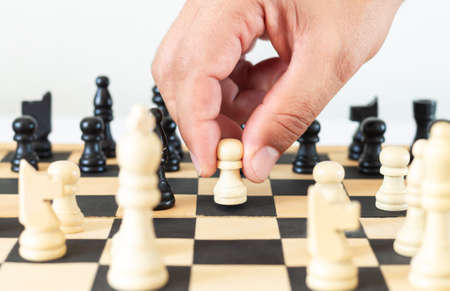 Close-up hand makes a pawn move, chess, chessboard, game, confrontation