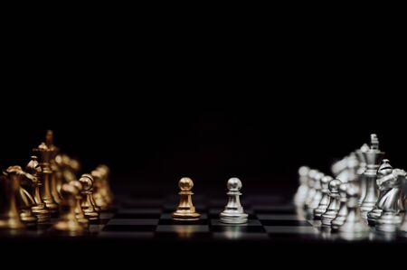 Golden chess are facing silver chess on black background. Business strategy, business competition, challenge or teamwork concept.