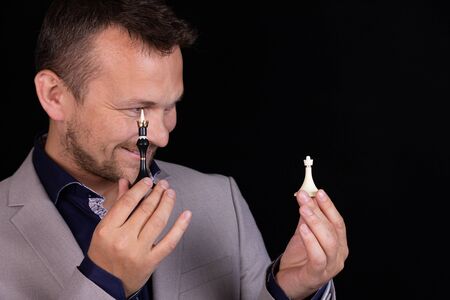 Businessman holds chess pieces in his hands on a black background. The concept of strategy, management or leadership.