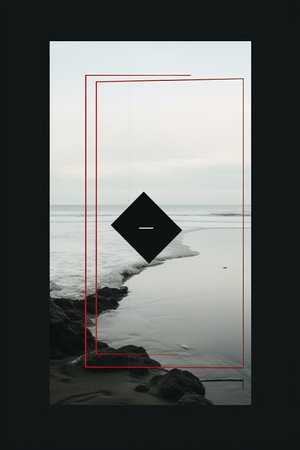 a black and white photo of a beach with a red square in the middle