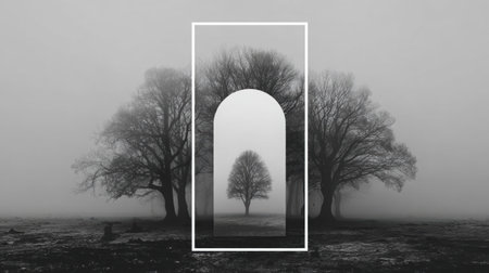 Black and white composition showcases three trees within a geometric arch, surrounded by fog, emphasizing tranquility and minimalism in a serene landscape