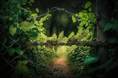 barbed wire fence surrounded by lush green foliage, created with generative ai