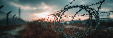 The sharp barbed wire stretches across a prison fence, creating an imposing barrier. Shadows deepen as dusk settles around the area, highlighting the stark reality of confinement. The composition evokes a feeling of isolation and security, emphasizing the harsh surroundings of the facility.