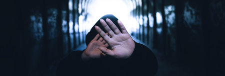 The man held his palm in front with five fingers as a signal to stop on black background with copy space for your text.