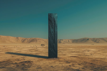 A photograph of a significant black object situated in the center of a vast desert landscape, A solitary monolith standing tall in a barren desert, AI Generated