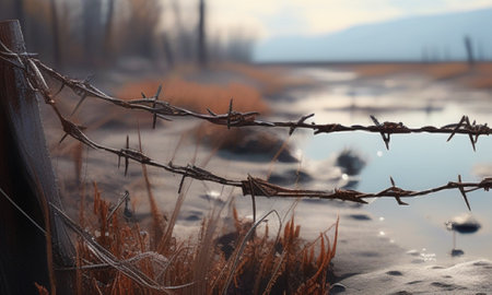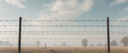 AI Generated. Barbed wire fence in rural landscape with copy space