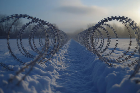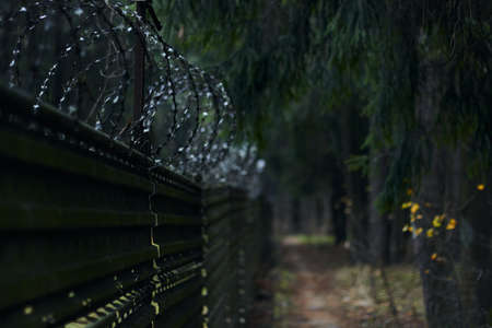 Barbed and razor wire fence. Fencing the state border against immigration