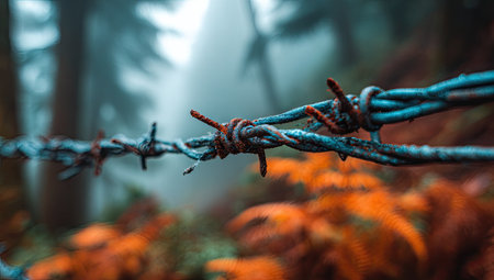 Close up of barbed wire in foggy forest. Selective focus.
