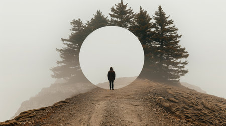 Lonely Person on Foggy Mountain Peak with Surreal Circular Void, Mystery and New Beginnings