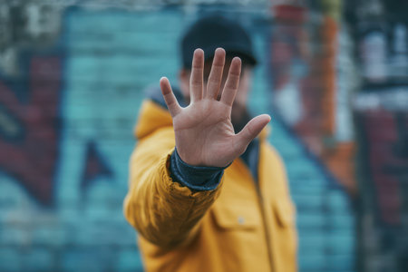 A man raises his hand to signal 'stop' in a clear and direct gesture, symbolizing boundaries, warning, or refusal.