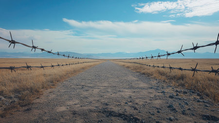 A striking landscape featuring a gravel road bordered by barbed wire, leading toward distant mountains under a clear blue sky, evoking peace and solitude.