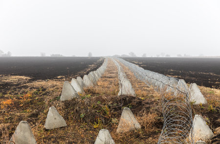 Dragon's teeth fortifications and barbed wire in Kharkiv region, Ukraine, during the Russian-Ukrainian war